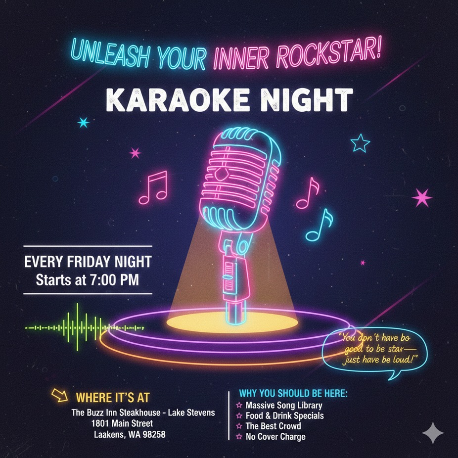 Karaoke with Wild Bill at the Buzz Inn Lake Stevens every Friday at 7pm